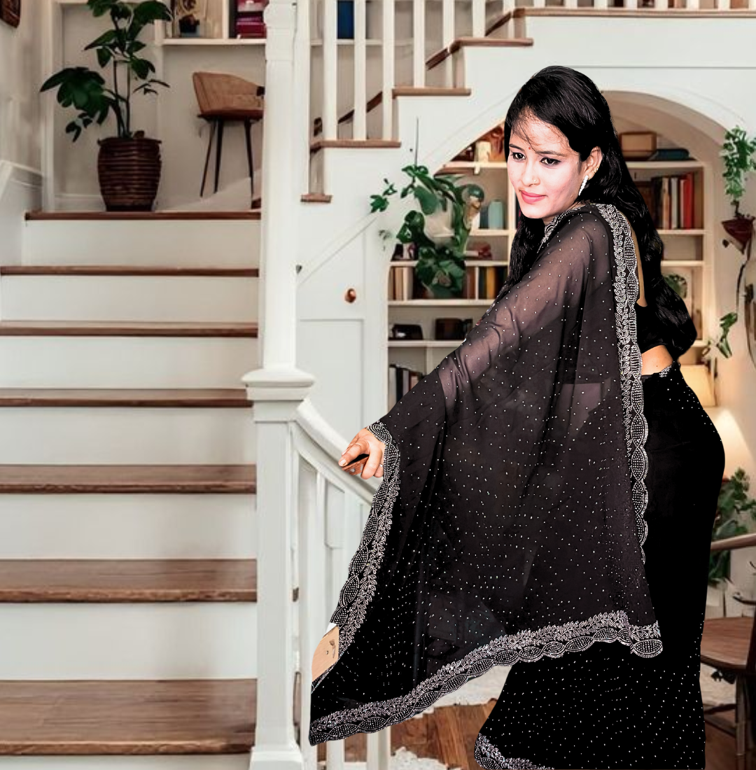 S4s Black Karishma Siroski Stones Lace Georgette Party Wear Saree